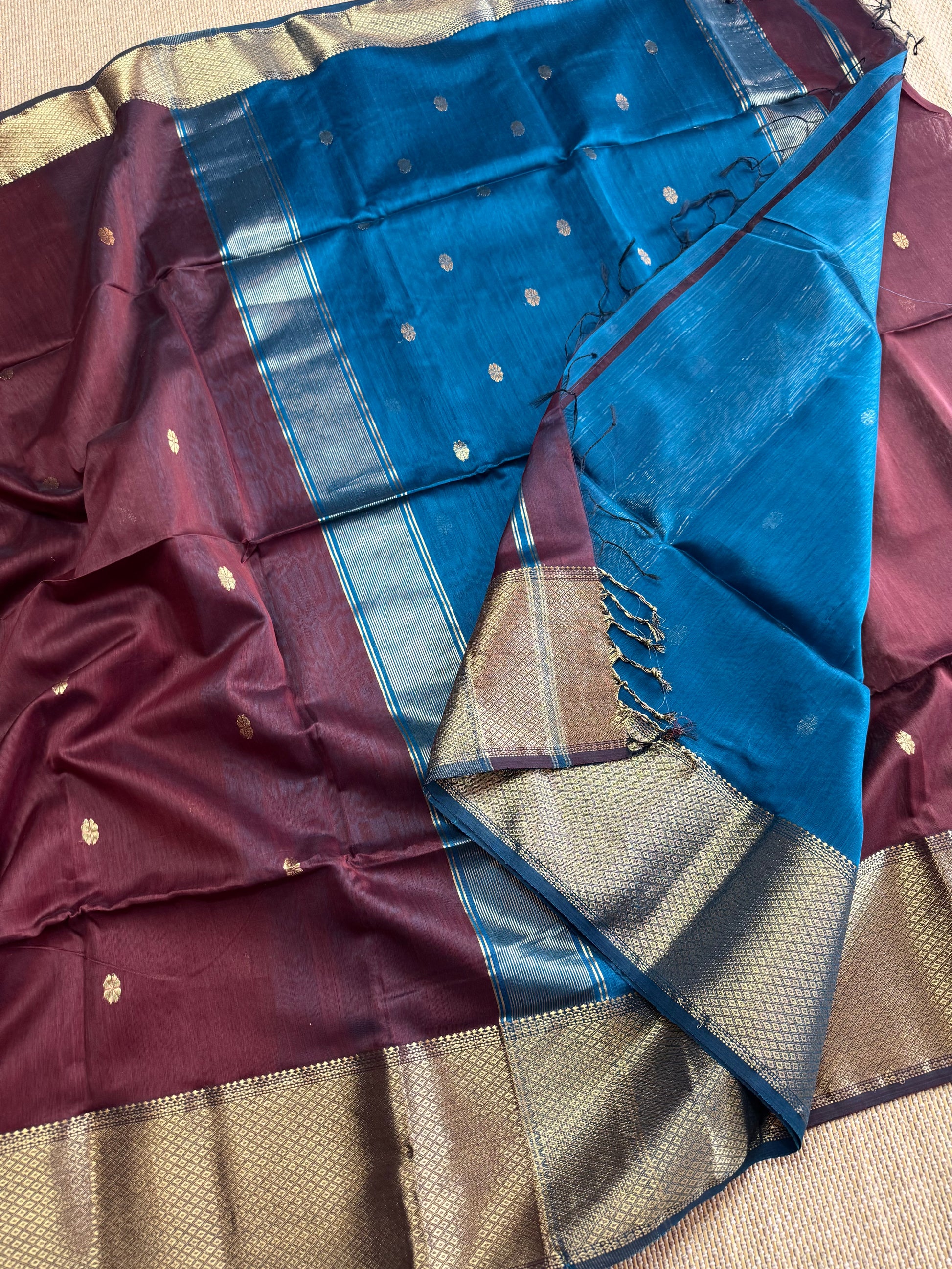 Pure Handloom Maheswar Silk Cotton Saree with gold zari border . Saree comes with contrast Pallu and and blouse follows the same color of Pallu . This gorgeous saree comes with Butti all over the saree.