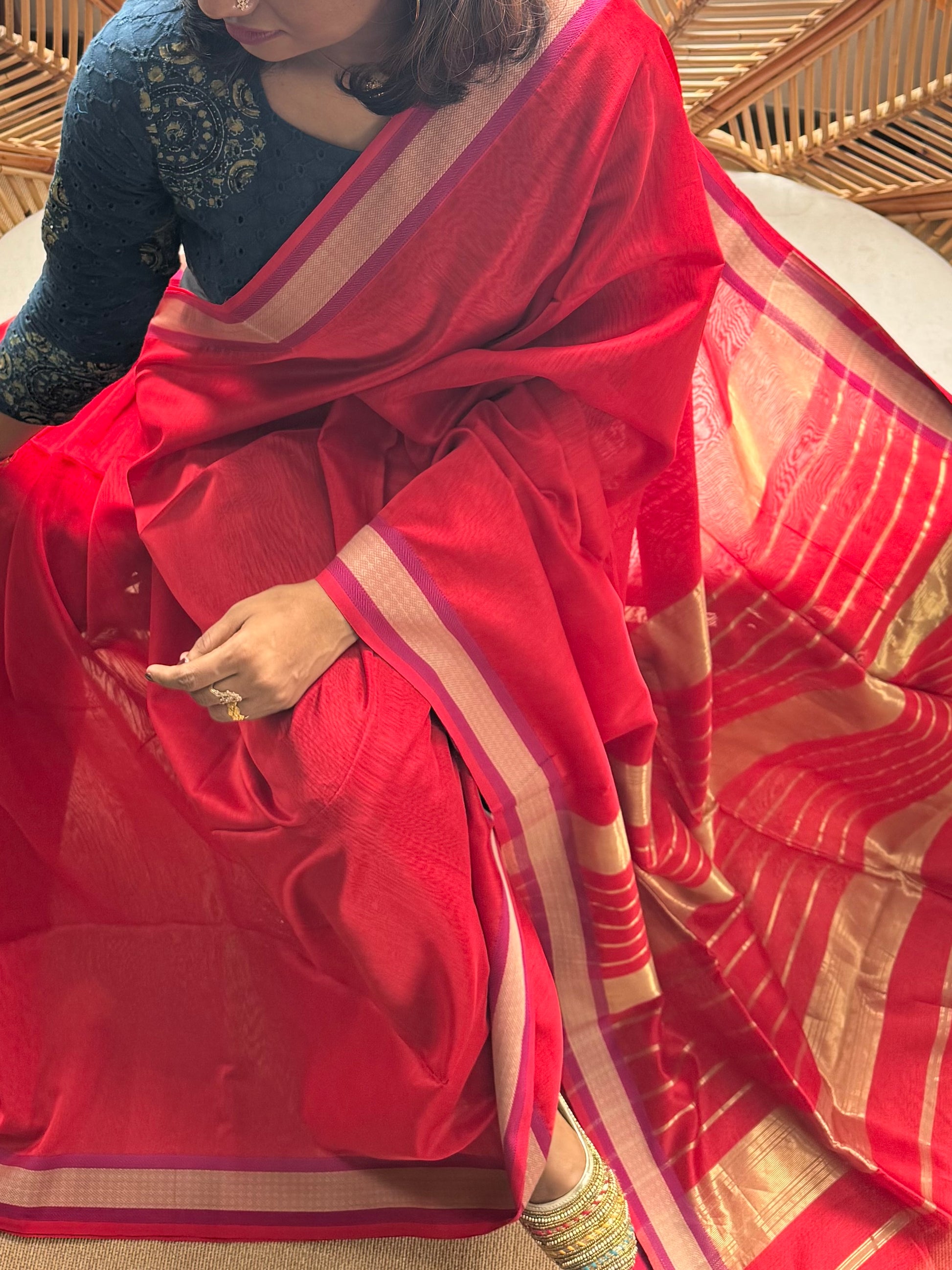 Pure Handloom Maheswar Silk Cotton Saree with gold zari border . Saree comes with running Pallu and and blouse follows the same color of Pallu . This gorgeous saree comes with Butti all over the saree.